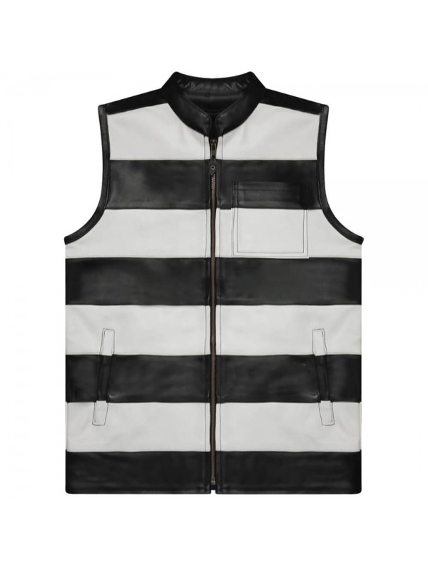 Gilet moto prison en cuir de vachette pleine fleur 1,2mm. Rayures noires et blanches cousues main, dans la tradition bagnard américaine. Fermetures et zip de marque YKK. Doublure polyester fixe avec 2 grandes poches internes, dont une avec zip. Une édition unique et limitée parmi notre collection de veste bagnard. Il reste dans le plus pur style Basara Japan directement travaillé sur l'esprit néo-rétro des vestes workwear. Les rayures sont horizontales afin trancher avec la verticalité des barreaux de prison, ainsi un évadé fuyant était facilement repérable dans la foule, aujourd’hui vous serez remarqués de loin, avec notre cuir prisonnier.
